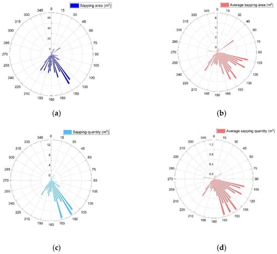 Sapping of the Wall with various azimuth: (a) sapping area of the Wall with various azimuth; (b) average sapping area of the Wall with various azimuth using 20 m as reference unit; (c) sapping quantity of the Wall with various azimuth; (d) average sapping quantity of the Wall with various azimuth using 20 m as reference unit.