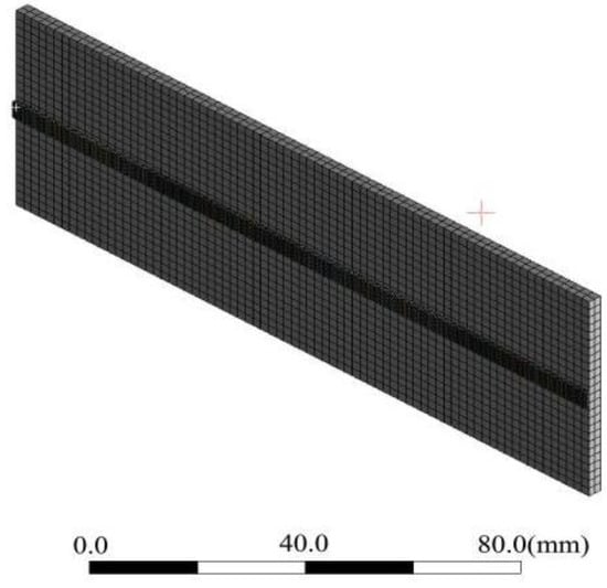 Based on the previous experimental results, to determine the size of the single-pass cladding layer, the base plate in the model is set to be 150 × 50 × 10 mm3, and the single cladding layer is 5 × 5 × 2 mm3. When the laser spot moves on the substrate in a certain direction at a constant speed, the powder is continuously fed to the substrate with the movement of the laser, and the temperatures of the powder and the substrate rise rapidly and then drop rapidly, forming a cladding layer. The three-dimensional model established by the finite element software (ANSYS) is shown in Figure 1.