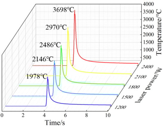 The temperature cycle curve of the molten pool at the same point under different laser power is shown in Figure 3. As the laser power increases from 1200 W to 2400 W, the peak value of the thermal cycle curve gradually increases, and each cycle curve has a similar heating–cooling process. The change in laser power affects the energy absorption of the substrate and powder materials. The higher the power, the more energy the material absorbs, resulting in a gradual increase in temperature.
