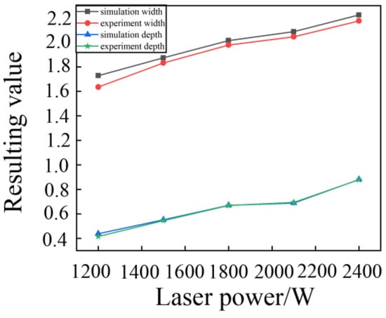 Comparison of experimental and simulation results, the effect of laser power on the size of the molten pool is shown in Figure 4.