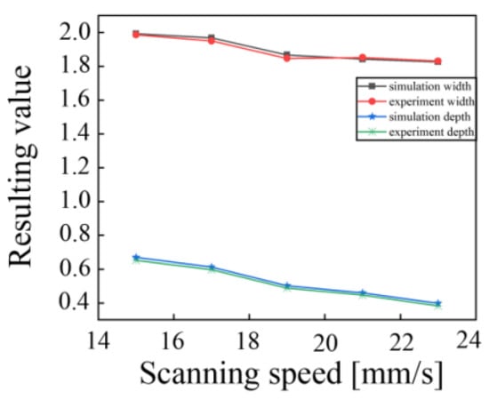 Comparison of experimental and simulation results, the effect of scanning speed on the size of the molten pool is shown in Figure 7.