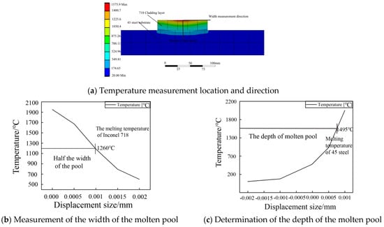 In order to verify whether the temperature field distribution of the established model is consistent with the actual situation, the size of the molten pool obtained by numerical simulation is compared with the experiment under the same parameters. In the central area of the molten pool, the temperature versus displacement distribution is plotted in the vertical scanning path width and depth direction, as shown in Figure 8, and the range above the melting point temperature is considered to be the width and depth of the molten pool [23].