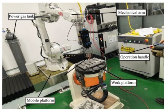 The laser cladding experiment uses a 3 kW flexible fiber laser cladding system. The system consists of a YLS3000 semiconductor laser, ABB six-degree-of-freedom robot, ZF annular cladding head, CWFL water cooling device, and RH-DFOM double-tube powder feeding device (Figure 9). It mainly includes a software system, laser, numerical control system, powder conveying system, protective gas conveying device, and workbench. The 45 steel specimen with a substrate size of 150 × 50 × 10 mm3 was finely ground and polished before cladding to improve the flatness and wiped with anhydrous ethylene to remove the surface oil.