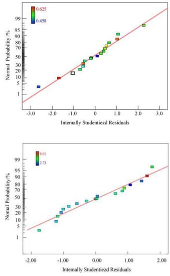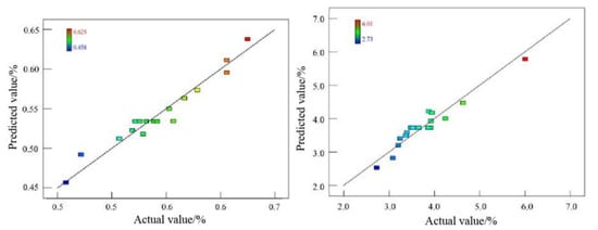 Based on the response surface method, with laser power (A), scanning speed (B), and the powder feeding rate (C) as independent variables, and dilution rate as the response variable, BBD (Box–Behnken Design) was used to design the experiment. Within the scope of the process, use the response module of Design-Expert to design the experimental plan. The level codes of each factor determined by the numerical simulation results are shown in Table 4, and the specific experimental scheme and results are shown in Table 5.