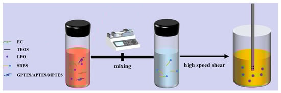 During the emulsion solvent diffusion, microcapsules were obtained based on the reported method []. Firstly, EC (0.15 g), appropriate TEOS, LFO, and a silane coupling agent (GPTES, APTES, or MPTES) were added into 3 mL of ethyl acetate and stirred to dissolve them evenly. The above solution was slowly added dropwise to the package containing 0.2 g SDBS and ethyl acetate aqueous solution by peristaltic pump, stirred continuously to form a uniform solution, and sheared at a high speed with a high-speed shear at 10,000 rpm for 15 min. Then, the resulting emulsion was poured into 60 mL of deionized water and stirred for 30 min to make the cellulose/silica material with encapsulated LFO (Figure 1), centrifuged for 3 min at 8000 rpm, then washed with deionized water after freeze drying at −58 °C for 24 h. For comparison, a blank microcapsule without LFO was prepared via the same above method.