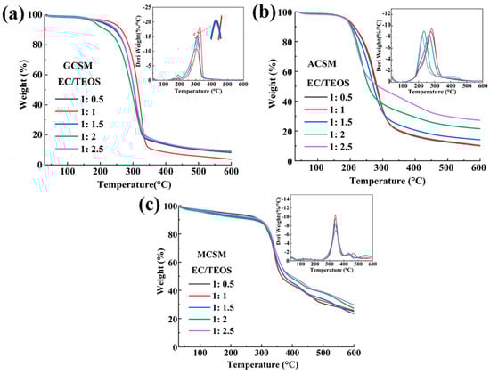 Figure 2a shows TG and DTG of the GCSM (GCSM: EC/SiO2 composites modified by GPTES), and the maximum weight loss rate (Tmax) of the composites obtained at different EC/TEOS addition ratios is shown in Table 1. With the increase in TEOS, the thermal degradation process can be divided into two processes. Approximately 5% of the weight loss rate occurred between 0 °C to 250 °C, which is due to the evaporation of residual water in the product at high temperatures, and 75% of the weight loss between 250 °C to 350 °C is due to the decomposition of EC. The weight loss between 350 °C to 600 °C is mainly due to the decomposition of SiO2 in the wall material [].