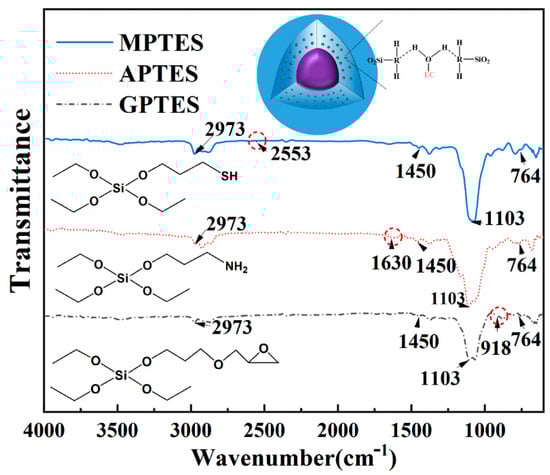 The results of Fourier transform infrared spectroscopy (FTIR) of the modified EC/SiO2 materials are shown in Figure 3. It can be observed from the figure that after silanization, the stretching vibration peak at 2973 cm−1 corresponds to -CH2 and 1450 cm−1 corresponds to the C-H shear vibration peak. A clear absorption peak at 1103 cm−1 is produced by the Si-O-Si stretching vibration in the silica nanostructure, and at 764 cm−1 is due to the symmetric stretching vibration of Si-O. The figure also shows the characteristic peaks of epoxy groups (918 cm−1), -NH2 (1630 cm−1), and -SH (2553 cm−1) for three different silane coupling agents, as shown by the red circle mark in the figure, indicating the successful polycondensation reaction of TEOS with GPTES, APTES, and MPTES, respectively [].