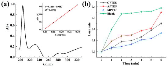 The standard curve of LFO are shown in Figure 6a. The absorbance of the sample was measured at the maximum absorption wavelength, and the amount of LFO can be calculated from the standard curve. The release behavior of fragrance microcapsules at a high temperature is shown in Figure 6b, comparing the effect of different silane coupling agents with ethyl cellulose fragrance microcapsules on the fragrance. The amount of fragrance in the microcapsules gradually decreased with time. In Figure 6b, the release rate of fragrance microcapsules without added silica reached 33% after 2 h treatment at 120 °C and 38.9% for 6 h. The three different silane coupling agents, GPTES, APTES, and MPTES, modified the shell material, and the fragrance release rates were 25.2%, 35.1%, and 16.7% after treatment of the microcapsules at 120 °C for 6 h. This demonstrated that the addition of modified SiO2 to EC enhanced the slow release of fragrance in microcapsules at high temperatures. Combined with the results of the FTIR analysis, the reason for the difference in the fragrance release results may be due to the introduction of -NH2 in APTES. Although it can improve the heat-resistant type of raw materials to some extent, the epoxy group and -SH in GPTES and MPTES combined with EC to form a wall material that protects the fragrance significantly more than -NH2. It indicates that EC and SiO2, after GPTES and MPTES modified and combined, the formed fragrance microcapsules have a significant slow-release effect and have a better protection effect on the fragrance.