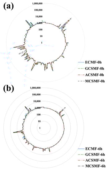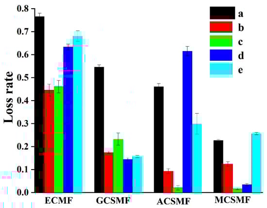 Figure 7 compares the E-nose radar images of three kinds of modified EC/SiO2 fragrance microcapsules and EC shell-material fragrance microcapsules before and after treatment at 120 °C. Figure 7a shows the aroma curves of four kinds of microcapsules before heat treatment, and Figure 7b shows the radar map of the aroma after treatment at 120 °C for 6 h. In Figure 7a, there are several peaks with high content and complex components, and the peaks of the four kinds of microcapsules almost coincide, which indicates that the fragrance microcapsules of modified microcapsules and ethyl cellulose shell materials are almost the same before heat treatment. In Figure 7b, the peaks of many components disappeared or decreased, indicating the volatilization or loss of small molecular aroma components. The peaks of many components disappeared or decreased after ECMF was treated at 120 °C for 6 h. This indicated that the EC shell material could not protect the small molecule aroma component in the fragrance better, which led to the volatilization or loss of aroma comments. Observe the heat-treatment results of GCSMF, ACSMF, and MCSMF: the characteristic aroma losses are less than ECMF. The above results show that the aroma retention value of silane coupling agent-modified composite shell-material fragrance microcapsules after scenting the cotton fabric is better than that of EC shell-material fragrance microcapsules.