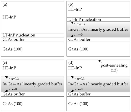 Figure 1. Schematic structure of an InP/GaAs virtual substrate prepared using (a) a two-step method; (b) an InGaAs linearly graded buffer combined with the two-step method; (c) the direct growth of HT-InP on the InGaAs linearly graded buffer; (d) the method “c” with additional three cycles of post-annealing.