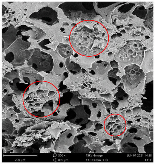 SEM images of the cross-section of F11 composite coating. The coating was fractured under liquid nitrogen. Red circles point out some of the cork granules present. Magnification: 300×.