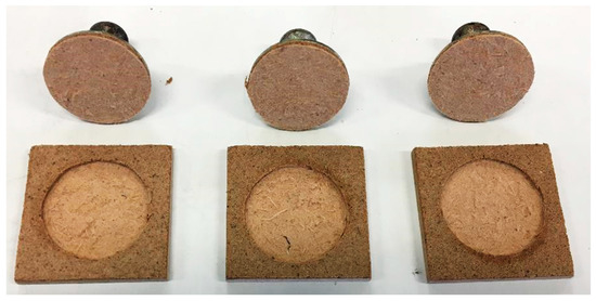 Surface hardness, measured on the Shore A scale with a durometer, was about 50 A. The coating with a 1:10 cork:resin ratio yielded slightly higher hardness than the one with 1:20. This is expectable since cork’s hardness is 60 to 70 A. Increasing its incorporation, therefore, contributes to increasing the coating’s hardness. Impact resistance was the same for both coatings, with the force necessary to produce permanent visible damage being 10 N. Abrasion resistance, on the other hand, was better for the 1:20 ratio. This may be related to the higher content of cork granules: under abrasive stress, the particles detach from the surface, leading to higher mass loss. The pull-off adhesion tests yielded equivalent results, since, in both cases, failure was observed to have occurred entirely at the HDF substrate, and not within the coating or at the coating/HDF interphase, as seen in Figure 5. This shows that the coatings’ cohesion and adhesion are excellent. The thermal conductivity was low and very similar for both formulations. This shows that the composite made of acrylic foam and cork granules has thermal insulation performance very similar to natural cork, which has thermal conductivity around 0.045 W∙m−1∙K−1 [2].