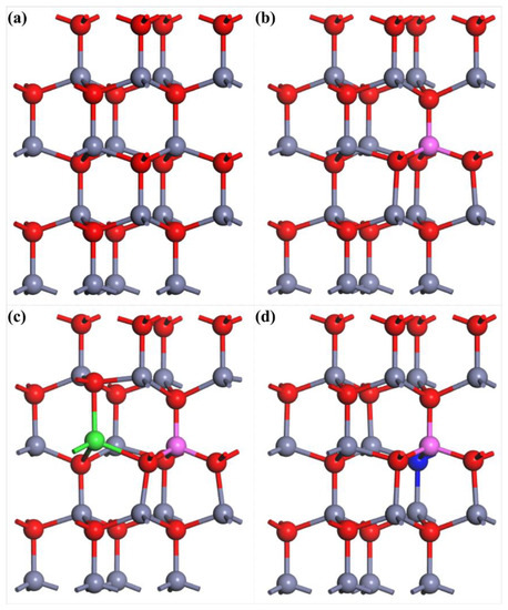 Optimized 2 × 2 × 2 supercell of ZnO (a), metal single doping ZnO (Al-ZnO) (b), metal/metal co-doping ZnO (Al/Ag-ZnO) (c), and metal/non-metal co-doping ZnO (Al/N-ZnO) (d), and the red, gray, pink, green, and blue spheres represent oxygen, zinc, aluminum, silver, and nitrogen atoms, respectively.