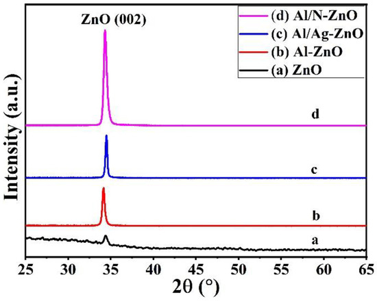 XRD patterns of ZnO (a), metal single doping ZnO (Al-ZnO) (b), metal/metal co-doping ZnO (Al/Ag-ZnO) (c), and metal/non-metal co-doping ZnO (Al/N-ZnO) (d).