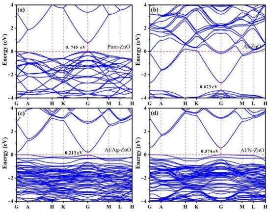 Band structures and band gaps of ZnO (a), metal single doping ZnO (Al-ZnO) (b), metal/metal co-doping ZnO (Al/Ag-ZnO) (c), and metal/non-metal co-doping ZnO (Al/N-ZnO) (d), respectively. The Fermi level is set to zero.