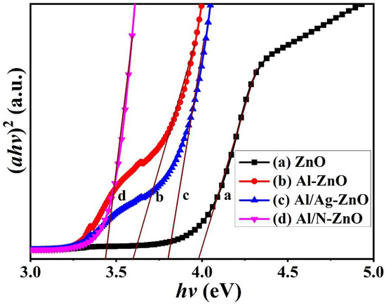 where the symbols α, h, v, A, and Eg are the absorption coefficient, Planck’s constant, the photon frequency, a constant, and the optical bandgap, respectively. Figure 4 illustrates (αhv)2 vs. hv plots of ZnO (a), metal single doping ZnO (Al-ZnO) (b), metal/metal co-doping ZnO (Al/Ag-ZnO) (c), and metal/non-metal co-doping ZnO (Al/N-ZnO) (d). In the region with high photon energy, if (αhν)2 and hν have a linear relationship, it indicates that the sample is a direct bandgap semiconductor. According to the position where the linear fitting line intersects the horizontal axis (αhν = 0), the optical bandgap Eg value can be obtained. The Eg values of ZnO is 3.98 eV; however, it is decreased to 3.59 eV, 3.80 eV, and 3.44 eV for metal single doping ZnO (Al-ZnO), metal/metal co-doping ZnO (Al/Ag-ZnO), and metal/non-metal co-doping ZnO (Al/N-ZnO), respectively.