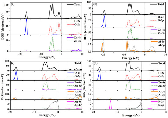 The density of states (DOS) and partial density of states (PDOS) of ZnO (a), metal single doping ZnO (Al-ZnO) (b), metal/metal co-doping ZnO (Al/Ag-ZnO) (c), and metal/non-metal co-doping ZnO (Al/N-ZnO) (d), respectively. The Fermi level is marked by a gray dashed line.