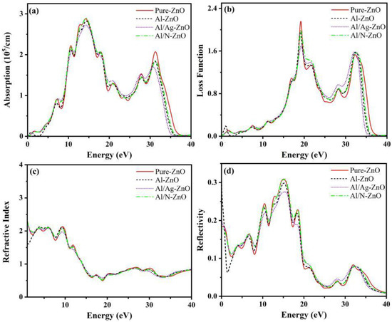 Figure 6a revealed the absorption of pristine and doped ZnO. The peaks in the x, y, and z directions appear at about 3.80 eV, 3.89 eV, and 3.92 eV, respectively. Al/Ag-ZnO has an absorption peak (19.95~21.24 eV), indicating that the light absorption is enhanced after metal/metal co-doping. The maximum peak of the total absorption coefficient is observed at around 14.23 eV, while the total absorption peak is at 2.90 eV. The energy-loss function is another important optical constant, which is usually used to evaluate the energy loss of electrons passing through a homogeneous medium. Figure 6b is the energy-loss function for pristine and doped ZnO with the peak at 19.19 eV. This peak reflects the characteristics related to plasma oscillation. For example, the oscillation frequency is the corresponding plasma frequency, and the maximum (or peak) is a multiple of the plasmon energy or frequency. In Figure 6c, the refractive index almost remains unchanged, especially in higher energy region. The reflectivity of the pristine and doped ZnO is displayed in Figure 6d. If the reflectivity is 1, this indicates that the material exhibits perfect reflectivity. The calculated reflectivity of Al-ZnO at 0 eV (surface) is 0.33, which shows that Al doping improves the reflectivity of ZnO.