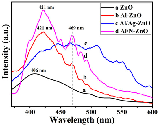 Figure 7 depicts the PL spectra of ZnO (a), metal single doping ZnO (Al-ZnO) (b), metal/metal co-doping ZnO (Al/Ag-ZnO) (c), and metal/non-metal co-doping ZnO (Al/N-ZnO) (d). The PL excitation source wavelength and the temperature regime are 325 nm and room temperature, respectively. The PL spectrum of ZnO shows a violet emission peak at 406 nm and other weak visible emission peaks. After Al doping, a strong blue emission peak at 421 nm is observed, and its intensity is further enhanced and attains the maximum for Al/N-ZnO. However, for Al/Ag-ZnO, the blue emission shifts toward a longer wavelength, and the intensity of the blue emission conversely decreases. Different researchers proposed different hypotheses about the origin of PL emissions related to defects, but so far, there is no consistent conclusion. For blue light emission in particular, its origin has always been the focus of debate among researchers because of its sparsity and instability. For example, Guo et al. [24] constructed type II band structures based on ZnO nanowire arrays and discussed their potential applications in photodetectors. Kang et al. [25] prepared nickel-doped ZnO electrodes for blue light-emitting diodes. Khokhra et al. [26] found that the visible light photo-detection capability of the ZnO nanostructure greatly depends on its morphologies. Ghosh et al. [27] fabricated ZnO-based heterojunction and discussed the emission mechanism of both the blue-violet and blue emission peaks.