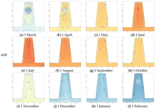 Through continuous monitoring of the temperature field of the test wall, it was found that the lowest point and highest temperatures occurred at around 04:00 and 16:00 over one day, respectively. Figure 6 shows the temperature field isotherms at 04:00 and 16:00 for 12 consecutive months.