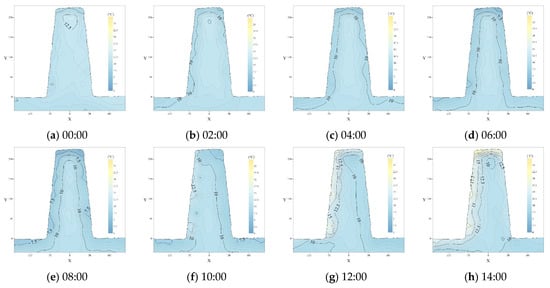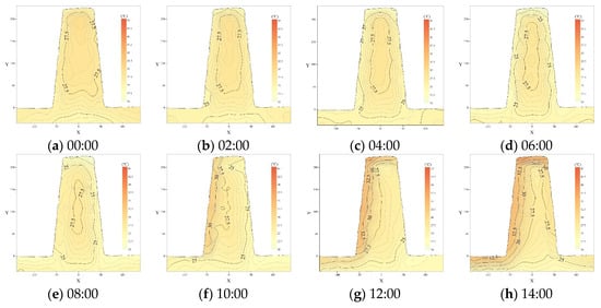 As can be seen from Figure 11, the internal temperature of the test wall was almost constant during this day in summer, and the largest temperature change was observed on the wall surface. The temperature gradually fell down to the lowest from 00:00 to 08:00, rose up to the highest from 08:00 to 16:00, and dropped slowly from 16:00 to 24:00. This indicates that the wall temperature gradually rose from 08:00 to 14:00, and the highest temperature was observed in the top corner area to the east of the test wall; the maximum temperature was 37.5 °C in this stage. The wall temperature was highest from 14:00 to 16:00, and the highest temperature area moved gradually from the east to the west, i.e., to the corner area on the west façade of the test wall, with a maximum temperature of 40 °C. The wall temperature decreased from 16:00 to 08:00 on the next day. It decreased slowly from 16:00 to 20:00 and then decreased sharply from 20:00 to 08:00 on the next day. The temperature curve gradually changed from an asymmetric to a symmetric elliptical spiral, and the surface temperature dropped to 22 °C.