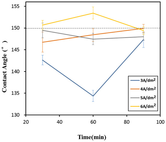 In this study, annealing is an important reason for the formation of superhydrophobicity in a limited time. To determine the appropriate time for annealing, we selected electroplated samples under 60 min and the current densities of 3–6 A/dm2. These samples were annealed at a series of time parameters, respectively, and then stored hermetically at room temperature. The results obtained are shown in Figure 2. For samples prepared at different current densities, the surface contact angle increased with increasing heating time.