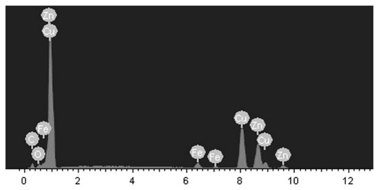 The EDS spectrum is shown in Figure 8 and the test results are listed in Table 2. The main elements of the coating are copper, zinc, and iron, which corroborate with the results of the XRD spectrum. In addition, a large amount of carbon was detected on the surface. The carbon element may come from the adsorption of hydrocarbons from the air. In order to confirm the present form of these elements on the surface, we performed an XPS analysis.