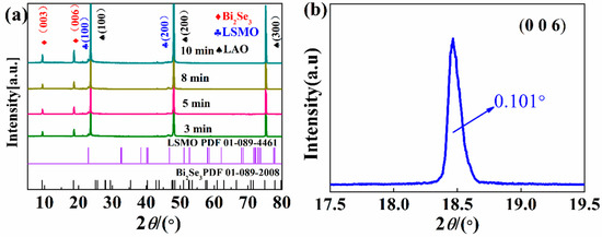 The three phases were observed in the spectrum as shown in Figure 1a, including Bi2Se3, LSMO and LAO (100). The Bi2Se3/LSMO thin films were based on LAO (100), so the XRD diffraction peak showed a strong LAO peak. LSMO had an a-axis orientation with (100) family peaks. The Bi2Se3 films showed (0 0 3n) reflection in the scanning range of 5°~80°, indicating that the film has high crystallinity along the growth direction [25]. Figure 1b shows the X-ray rocking curve of the Bi2Se3 sample (006) peak with deposition time t = 8 min. The diffraction peak was sharp and symmetrical, and the FWHM was 0.101°. The relative intensity of Bi2Se3/LSMO increased slightly with the increase of deposition time of Bi2Se3 films. Moreover, the XRD spectra of all samples were similar, indicating that the crystal quality of Bi2Se3 and the uniformity of thin films can be well reproduced on LSMO/LAO (001).