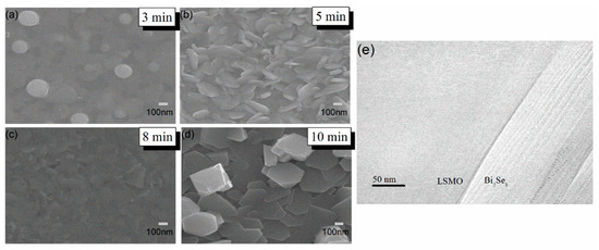 To study the influence of different deposition times on the morphology of thin films, the surface of the Bi2Se3 films was scanned through the SEM technique. Figure 2a–d shows the SEM images of Bi2Se3 films deposited on LSMO/LAO substrates with different deposition times, which ranged from 3 min to over 10 min. The films consisted of continuous nanosheets, with no cracks and voids. The surface of the sample deposited for 3 min was flat, which had some very small particles. With the increase of deposition time, these particles gradually formed a flake structure. The hexagonal structure was obviously observed in the sample with t = 10 min. The layered structure and hexagonal structure in the sample were clearly observed, in agreement with the XRD analysis [26,27]. For the Bi2Se3 films on LSMO/LAO with a different deposition time, the relative atomic ratio of Se/Bi was in the range of 1.43 to 1.47, which was lower than the nominal ratio of 1.5 in EDX results, as shown in Table 1. It is assumed that a small amount of Se vacancy occurred in the films. Figure 2e shows the TEM of the Bi2Se3/LSMO heterojunction with t = 8 min. The layered structure of Bi2Se3 can be clearly observed. The interface of Bi2Se3/LSMO has clear boundaries with no transitional region, which indicates that there is no obvious diffusion or chemical reaction between Bi2Se3 and LSMO.
