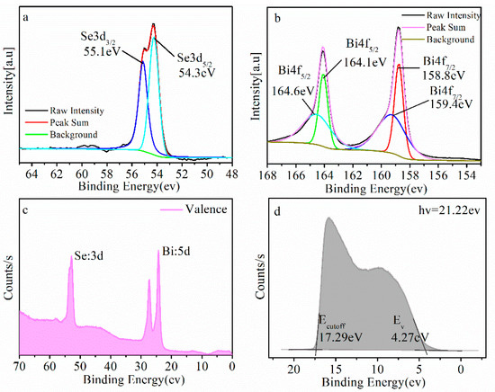The XPS and UPS analysis of the spectrum are shown in Figure 3. C 1’s peak is often used for binding energy referencing in XPS by using the calibration method based on C 1’s peak position, and work function, : [28]. The value for C 1’s peak after calibration was 285.65 eV. The binding energies of Se and Bi were calibrated by 285.65 eV, as shown in Figure 3a,b.