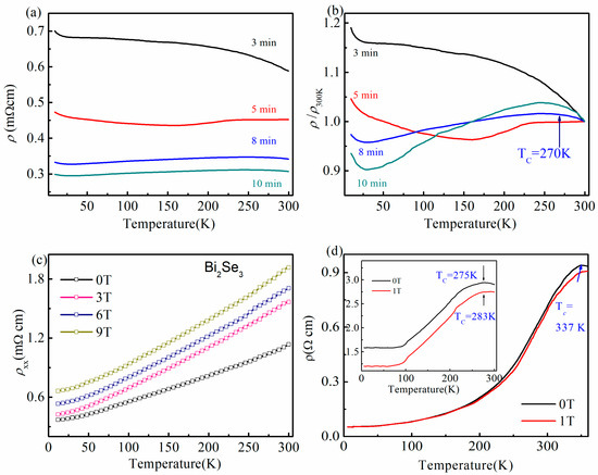 The Bi2Se3 samples with deposition time t = 3 min exhibited complete insulation behavior in the whole measured temperature range, which was likely due to much stronger scattering from disorder and porosity [39]. These three samples (t ≥ 5 min) showed a metallic R vs T due to the existence of Se vacancies, as shown in Figure 4b [29]. For the t = 5 min, the metal insulation transition behavior began to appear at about 170 K. When t ≥ 8 min, with the decrease of temperature, the resistance increased at first, reached the maximum at about 270 K, and then decreased. The difference of sample resistance behavior is related to different deposition times of Bi2Se3 and intrinsic transport properties of Bi2Se3 and LSMO [40].