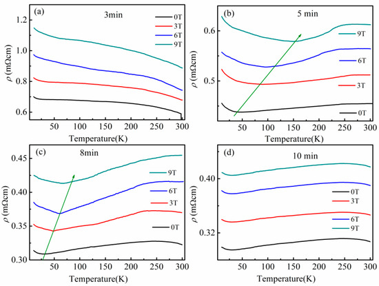 Below 250 K, the electrical resistance decreases with the decrease of temperature. With decreasing temperature, the resistivity decreases, reaching a minimum. Then, the resistivity increases below the transition temperature Tmin. As the magnetic field increases, Tmin moves to a high temperature, shown in of Figure 5b,c, which manifests that the magnetic field has a great influence on the total conductivity.