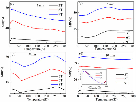 Temperature-dependent magnetoresistance (MR) ratio of Bi2Se3/LSMO/LAO thin films under different applied magnetic fields: (a) 3 min; (b) 5 min; (c) 8 min; (d) 10 min. Inset in (d): The relationship between the relative resistivity and T below 30 K.