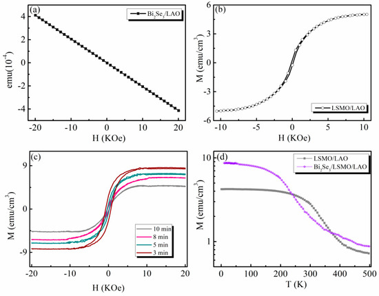 Figure 8 shows magnetization versus applied magnetic field curves for the bilayer films Bi2Se3/LSMO. The Bi2Se3/LAO film was diamagnetic, consistent with previous reports, as shown in Figure 8a [57]. The magnetization at 10 K for Bi2Se3/LSMO films had obvious saturation and hysteresis that are shown in Figure 8b, which are evidence of ferromagnetic signals. The coercive field Hc = 105 Oe for Bi2Se3/LAO film. The magnetization data also confirmed that magnetism was induced in Bi2Se3 films. Figure 8c draws the magnetic hysteresis loops of Bi2Se3 film on LSMO/LAO measured at 10 K. There were obvious hysteresis loops in the Bi2Se3/LSMO/LAO substrates, indicating the existence of ferromagnetic states in the films. The coercive field Hc = 726 Oe for t = 3 min sample, Hc = 315 Oe for t = 5 min sample, Hc = 279 Oe for t = 8 min sample and Hc = 252 Oe for t = 10 min sample, decreasing as the deposition time increased. The coercive field of Bi2Se3/LSMO/LAO was slightly larger than that of LSMO/LAO, which could be attributed to interface exchange coupling [58]. The saturated total magnetic moment of Bi2Se3/LSMO samples (8 min) was about 27% higher than that of LSMO/LAO samples, as shown in Figure 8b,c, which indicates that additional induced magnetic moments were generated in heterojunctions through short-range ferromagnetic exchange at the interface [59]. The short-range proximity effect between LSMO and Bi2Se3 mainly comes from charge transfer and redistribution, orbital hybridization and exchange coupling [19,59]. The characteristic scales of effects are generally under 10 nm due to the localization [45]. The field-cooled magnetization curve for Bi2Se3/LSMO samples is shown in Figure 8d. It can be further proved that magnetism was induced in Bi2Se3. The Curie temperature of the LSMO/LAO film was around 350 K, while the Curie temperature of t = 5 min Bi2Se3/LSMO sample was about 270 K. Below 270 K, the rapid increase of magnetization M of Bi2Se3/LSMO/LAO with the decrease of temperature T was caused by ferromagnetic phase transition, which is consistent with the LSMO film itself. Above 270 K, M was larger than that of LSMO, indicating there were some amounts of magnetic moments induced in the Bi2Se3/LSMO/LAO heterostructure.