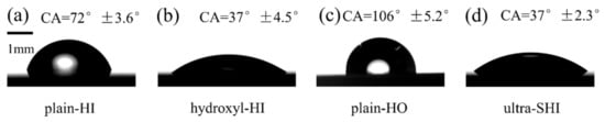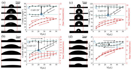 The contact angle is the most intuitive and accurate representation of the surface wettability and was measured by a contact angle measuring instrument (OCA 25, Dataphysics, Germany) in this work. As shown in Figure 2, the static contact angle (CA) of the plain-HI surface, the hydroxyl-HI surface, the plain-HO surface, and the ultra-SHI surface was 72° ± 3.6°, 37° ± 4.5°, 106° ± 5.2°, and 37° ± 2.3°, respectively. In addition to the static contact angle, the contact angle hysteresis (CAH), which is dependent on both the chemical uniformity and the physical smoothness, was measured in order to characterize the wettability of the solid surface. The contact angle hysteresis of a droplet on the surface was measured by changing the volume (V) of a water droplet in this work. The volume variation was performed as follows. A droplet with a volume of 5 µL was first pre-deposited onto the surface. Water to a volume of ΔV = 5 µL was injected into the droplet at a prescribed flow rate of 2 µL/s. The droplet was then left to rest for 30 s to allow enough time for the contact line to stabilize. The droplet volume was then increased by 5 µL each time until the volume reached 50 μL. Subsequently, water to a volume of ΔV = 5 µL was withdrawn from the droplet at the same flow rate and the above process was repeated until the droplet volume returned to 5 µL. The experiments were repeated at least five times for each surface.