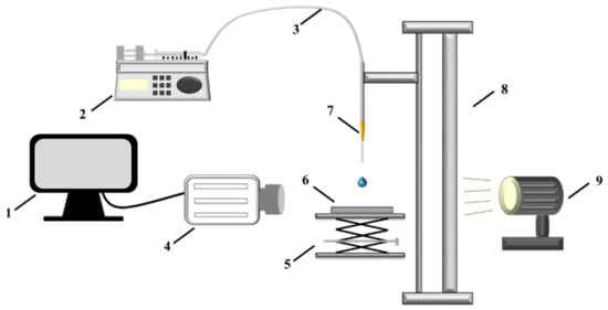 Experimental setup for measuring the droplet impact and spreading characteristics on the substrate surface: 1, Computer; 2, Injection pump; 3, Catheter; 4, High-speed camera; 5, Carrier table; 6, Surface; 7, Needle; 8, High-precision linear slide; 9, Light source.