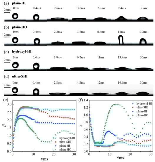 To eliminate the influence of the initial droplet size, the dimensionless size (β = D/D0, ε = H/D0) was used to analyze the evolution of the droplet impact on the test surface. Figure 5e,f show the results for the spreading factor β and the dimensionless recoiling height ε at the We number of 28.71. After the droplet impacts the surface, the droplet spread is dominated by the inertial force. The spreading diameter and the droplet height show a trend of increasing and decreasing, respectively, and the droplet height curve on the surface fluctuates periodically with a decrease in the amplitude. In the initial spread regime, there is no significant difference between the droplet spreading curves and the recoiling height curves on the four test surfaces. The maximum spreading factor βmax of the test surfaces exhibits an obvious difference. βmax was found to be larger for the droplet on the surface with a smaller contact angle, causing a larger amount of energy dissipation during the spreading process. At the same time, the initial oscillation time increased from 4.4 ms to 7.6 ms, and the recoiling speed and the oscillation amplitude decreased when the contact angle decreased. It can be seen from Figure 5e that the βmax of the ultra-SHI surface is the largest (2.84) when compared with that of the hydroxyl-HI, plain-HI, and the plain-HO surfaces (2.78, 2.29, and 2.09, respectively). When the droplets impact and make contact with the surface, the initial kinetic energy of the impacting droplet is not only used to overcome the viscous resistance but also transformed into the surface energy of the liquid film gradually due to the increase in the gas–liquid interface and liquid–solid interface. With a decrease in the contact angle, a larger amount of interfacial energy and a larger amount of viscous dissipation occur during the spreading of droplets on hydrophilic surfaces. Compared with the hydroxyl-HI surface, although the contact angle and βmax are similar, the time required for the droplet impacting upon the ultra-SHI surface to reach the βmax is shorter, which is important for the rapid supply of liquid in many applications [38,71]. Thus, even for hydrophilic surfaces, low surface hysteresis can reduce the amount of dissipation caused by surface friction during the droplet spreading process and reach the maximum spreading area more quickly. After the impacting droplet reaches the maximum spread diameter, the contact angle changes from a dynamic advancing contact angle to a receding contact angle, which causes a delay in the onset of the droplet’s retraction. Then, the spreading factor starts to decrease and finally remains at a constant value. A slight oscillation process was observed on the droplet on the ultra-SHI surface during the retraction process, while almost no oscillation was present on the hydroxyl-HI surface.