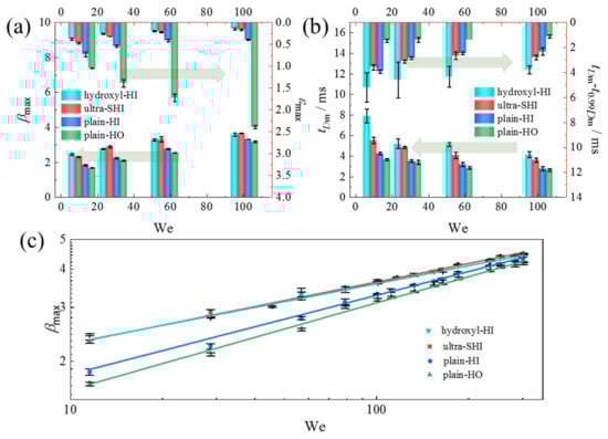 According to the energy conservation of the droplet spreading process, it was assumed that the kinetic energy of the impacting droplet would be completely transformed into surface energy without energy dissipation, and the maximum spreading diameter would follow the one-half power law Dmax/D0~We1/2. For a low-viscosity liquid, the prediction model of the maximum spreading diameter can be modified to Dmax/D0~We1/4 [72]. In addition, many prediction models have been proposed to calculate the maximum spreading diameter under different conditions [73,74]. It has been found that the inertial, capillary, and viscous forces are important in most practical cases, and the droplet spreading characteristics depend on the relative importance of each force. Equating inertial forces with capillary or viscous forces alone cannot accurately predict the droplet spreading characteristics [74,75]. The impact factor of WeRe−4/5 has been also proposed to determine the linear relationship. When WeRe−4/5 > 1, Dmax/D0 is only related to the Reynolds number, namely Dmax/D0~Re1/5 in the viscous regime. When WeRe−4/5 < 1, the Reynolds number can be omitted and Dmax/D0 corresponds to the We1/4 scaling for a low-viscosity liquid. Figure 6c compares the maximum spreading factor of the droplet impacting upon the test surface in the range of We numbers between 10 and 300. In all cases, the maximum spreading diameter increases with the increase in the We number. For the droplet impact on the plain-HI and plain-HO surfaces, Dmax/D0 conforms to the Dmax/D0~We1/4 mentioned in the literature. When the impact factor satisfies WeRe−4/5 < 1, Dmax/D0 conforms to We1/5 for a droplet impacting upon the hydroxyl-HI and ultra-SHI surfaces.