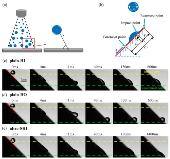 Figure 8b shows the spreading diameter of the droplet Ds/D0 over time t on the test surface. The maximum contact diameter of the droplet (Dsmax) was defined as the contact diameter corresponding to the peak value in the curve. There is no significant difference between the three curves in the initial spread regime. The collision law of the droplet is the same as that of the horizontal surface: the Dsmax and the amount of time the droplet takes to reach Dsmax are larger when the contact angle is decreased. After reaching Dsmax, the droplet retracts and the spread diameter begins to decrease, driven by surface tension. The retraction speed slows down and the time required to reach stability is longer with the decreasing contact angle. Figure 8c shows the gliding distance of the droplet L/D0 over time t on the test surface. The decrease in the contact angle results in a longer wetted length of the impacting droplet along the x-axis and a decreased gliding distance. In this case, the downward movement speed of the droplet on the plain-HO surface is slightly faster, and, finally, the surface is stably wetted and the gliding distance does not change. Different from the droplet-pinning phenomena on the plain-HI and plain-HO surfaces, the droplets impacting upon the ultra-SHI surface can continue to move downward and the gliding distance continues to increase after the retracting regime ends.