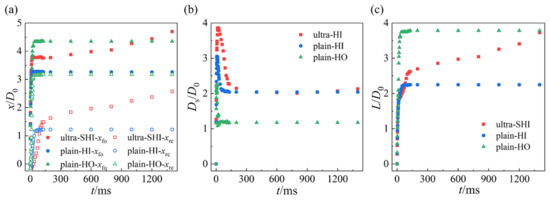 Figure 8a shows the displacements of the foremost point xfo and the rearmost point xre of the droplet over time t on the test surface with different surface wettability values. The displacements of the foremost point and the rearmost point of the droplet are asymmetric to the impact point. When the inclination angle is 45° and We = 28.71, for the plain-HO and plain-HI surfaces, the displacement of the foremost point xfo increases continuously over time until it reaches the maximum value and then stabilizes. The displacement of the rearmost point xre firstly decreases to a minimum value, then slowly increases to a positive value, and finally reaches a stable value. This is because the rearmost point of the droplet first spreads out in a direction above the impact point, then moves down in the retraction regime, and eventually falls below the impact point. The spreading curves of the droplet impacting upon the inclined ultra-SHI surface are similar to those of the droplet impacting upon other surfaces in the spreading, gliding, and retraction regimes. In the retraction regime, xfo remains unchanged and then xre increases continuously. However, xfo and xre increase at the same time after the retraction regime ends, demonstrating slipping within a stable wetted area. In the spreading regime, all the droplet spreading curves overlap with each other, and the influence of wettability on spreading is not obvious. The rearmost point of the droplet no longer recedes but glides downward along the inclined surface when the droplet enters the gliding regime. A difference in the velocity between the rearmost and foremost points was observed due to the different surface wettability values. As shown in Figure 8a, the displacement of the foremost point for the droplet impacting upon the plain-HO surface is larger than that for the hydrophilic surfaces due to the weaker solid–liquid interaction. The smaller the contact angle of the solid surface is, the larger the displacement of the foremost point is. For the rearmost point, greater spreading along the negative direction, namely |xre|, was found with the decrease in the contact angle. A decrease in the static contact angle leads to the extension of the spread duration and delay in the initiation of the retraction regime. The equilibrium state is reached more slowly. Due to the large hysteresis of the droplet on the plain-HI and plain-HO surfaces, the impacting droplet finally reaches a static state on the surface and the displacement of the foremost and rearmost points remains unchanged. While the contact angle hysteresis of the ultra-SHI surface is small, the droplet moves downward because the gravity component on the x-axis is large enough to overcome the frictional resistance of the droplet gliding along the surface. Even after the retraction regime ends, the displacement of the foremost and rearmost points continues to increase.