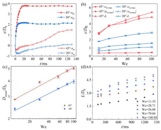 As shown in Figure 7a, a droplet impacting upon a solid surface usually has different angles with the substrate in many practical applications, such as spray cooling. An analysis of impacting droplets on inclined surfaces was performed to investigate the spreading characteristics of impacting droplets, and the results were compared with those on horizontal surfaces. To quantitatively describe the droplet impacting upon the inclined surface, a coordinate system was defined and is shown in Figure 7b. The point where the droplet first impacts the surface was defined as the origin, and the positive direction of the x-axis is parallel to the downward direction of the inclined surface. In the process of the droplet’s movement, the most anterior point and the last point on the surface were defined as the foremost point and the rearmost point, respectively. The distance between the foremost point and the impact point was defined as xfo, and the distance between the rearmost point and the impact point was defined as xre. The contact diameter between the droplet and the substrate during the droplet’s movement was defined as Ds. The distance from the droplet impact point to the center point of the moving droplet was defined as the gliding distance L.
