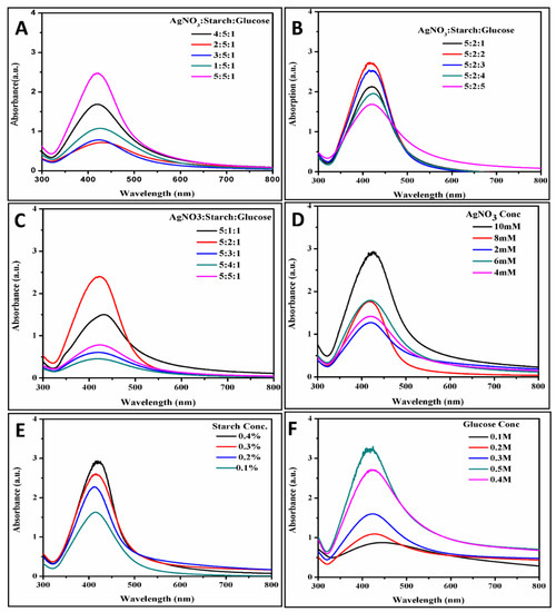 UV spectra relating to AgNPs’ formation at diverse volume ratios of (A) 10 mM AgNO3 (1 to 5 mL), (B) 0.1 M glucose, (C) 0.2% starch, and (D) at 5 mL of different concentration of AgNO3, (E) at 2 mL of various concentrations of starch, (F) at 2 mL of various concentrations of glucose.