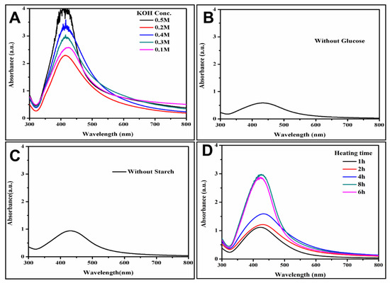 A controlled experiment without glucose and starch was carried out. UV spectrum shows that in the absence of glucose and starch absorption, 430 nm is the minimum (as shown in Figure 3B,C). This might be due to a slight reduction of Ag+ to Ag0 in the absence of glucose that acts as a reducing agent, whereas starch act as a stabilizing agent. In the absence of starch AgNPs are unstable and get aggregated, which results in a decrease in surface plasmon resonance peak [34]. AgNPs can form even in the absence of KOH and UV spectra reveals that absorption of AgNPs gradually increases (as given in Figure 3D), with a raise in heating time in the absence of KOH.