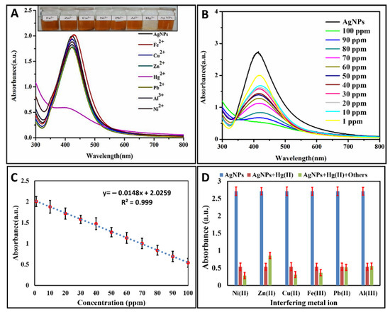 (A) Photographs and UV absorption spectra of AgNPs dispersions containing 100 ppm of Hg2+, Zn2+,Fe2+, Pb2+, Ni2+, Al3+, Ni2+, or Cu2+ demonstrating the change in the color of nanoparticles upon addition of Hg2+; (B) UV absorption spectra of AgNPs dispersions upon adding various concentrations of Hg2+; (C) linear or direct relationship between the absorbance and Hg2+ concentrations; (D) selectivity of Ag-NPs at 430 nm: the blue bar shows the absorption intensity of AgNPs, the brown bar represents the absorption intensity of AgNPs + Hg2+ and the green bar represents the absorption intensity of AgNPs + Hg2+ in the presence of other metal ions.