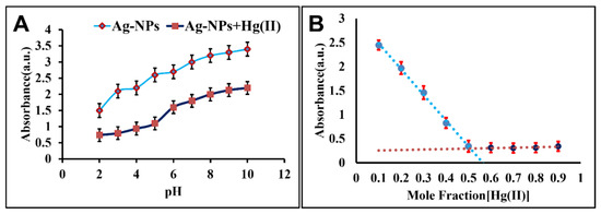 (A) Effect of pH on the adsorption of AgNPs in the absence and presence of 100 ppm Hg2+ ions, (B) Job’s plot curve showing the binding ratio of AgNPs:Hg2+.