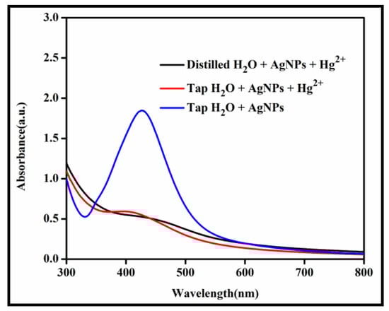 Finally, as shown in Table 2, the proposed method was applied to real tap and lake water samples. In order to verify the recovery and accuracy of the procedure, these samples were also spiked with known levels of Hg2+. A volume of 1 mL of Hg2+ solution was added into 1 mL of tap water sample of AgNPs and after some time the solution became colorless, as was done for Hg2+ sensing in distilled water. Moreover, UV-visible spectra revealed that the peak became broadened at 430 nm (as shown in Figure 6) and the same results observed in distilled water are obtained. Hence, AgNPs are found to be effective for the detection of Hg2+ in tap water samples [52].