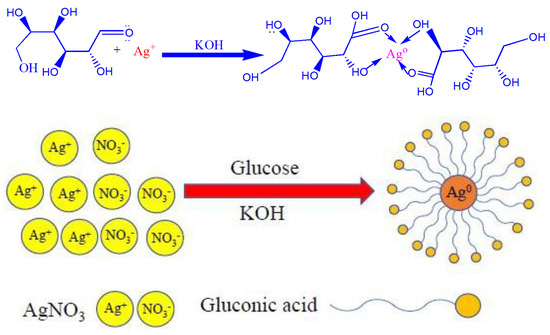 This reaction is an example of hydrolysis of starch that is catalyzed by a base (KOH) giving simpler molecules, like glucose. Glucose is used as a reducing agent for silver nitrate to silver metal. During the reaction, the aldehyde group of glucose reduces Ag+ to Ag0 and is oxidized to gluconic acid (as shown in Scheme 2), while the starch stabilizes silver nanoparticles.