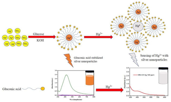 Colorimetric detection of particular analytes of interest by using AuNPs and AgNPs is a common practice because of color changes which are simply viewed with naked eyes instead of complicated instruments [32]. These nanoparticles are used as colorimetric probes for sensing lethal metal ions from ecological samples via cheap and simple procedures [33]. Compared to AuNPs, silver nanoparticles have several benefits such as low cost, easy preparation, etc. Further, AgNPs can also be oxidized by Hg2+, which causes color change and decrease in the UV-visible UV spectrum absorption of the AgNPs.