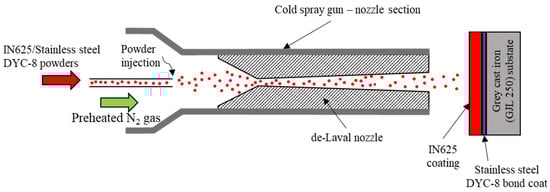 Cold spray is an alternative technique to deposit IN625 onto grey cast iron for repair purposes. It is a low-temperature additive manufacturing process where particles are accelerated to supersonic speeds and impact on the target substrate surface to form a deposit or coating. The particles remain in their solid-state condition throughout the process since the bonding mechanisms are a possible combination of adiabatic shear instability [], pressure-driven hydrodynamic jetting [], and mechanical interlocking []. The detailed working principles of the cold spray process have been widely reported in the literature [,,,,,,,,,,,,,]. Several advantages of the cold spraying IN625 coating onto grey cast iron include minimal phase change, oxidation, and residual stresses. These conditions would allow the bonding of dissimilar materials, such as IN625 and grey cast iron.