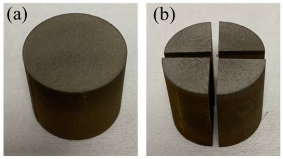 The IN625 coatings were deposited using PCS 100 (Plasma Giken, Yorii, Japan), and the schematic is shown in Figure 1. The working gas used was N2 and it was pressured to 60 bar and heated to 900 °C before deposition. The standoff distance from the nozzle outlet to the substrate surface was 35 mm, while the traverse scan speed was 500 mm/s. The powder feed rate was set at 65 g/min. The deposition process continued until the desired coating thickness of 1 to 1.2 mm was achieved. The DYC-8 bond coat was deposited prior to the IN625 coatings, with an average thickness of 50 μm. The spraying parameters for DYC-8 bond coat are not disclosed due to confidentiality. The coated substrate was then extracted into discs (diameter × height: 25 mm × 20 mm) and quartered into smaller samples using wire electrical discharge machining (EDM) for heat treatment (Figure 2).